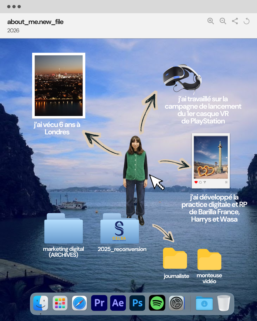 Après 18 ans dans la communication digitale, je suis revenue à mes premiers amours : la vidéo et le journalisme. En janvier 2025, j’ai repris des études de journalisme au CELSA (master 2), et obtenu en parallèle ma certification de monteuse audiovisuelle en juin 2025.